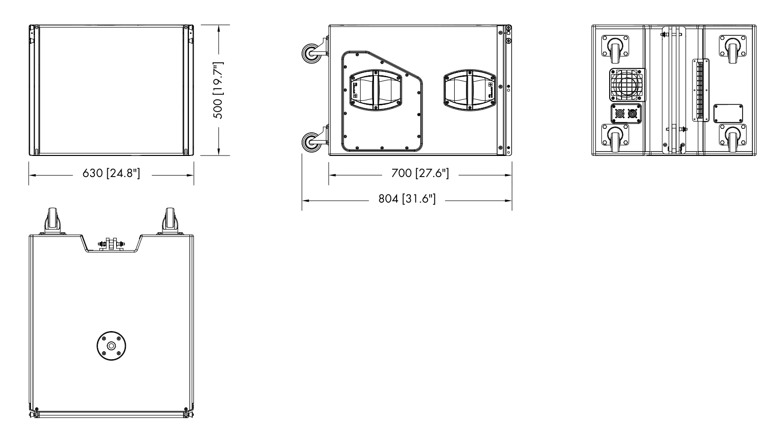 4.Speaker is protected by a rigid metal grill backed by an acoustically transparent foam, whilst the side panels incorporate two handles with four wheels mounted to the rear.